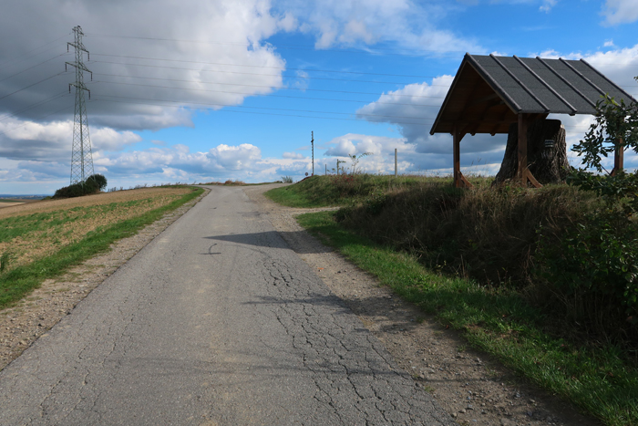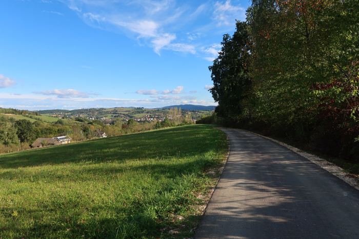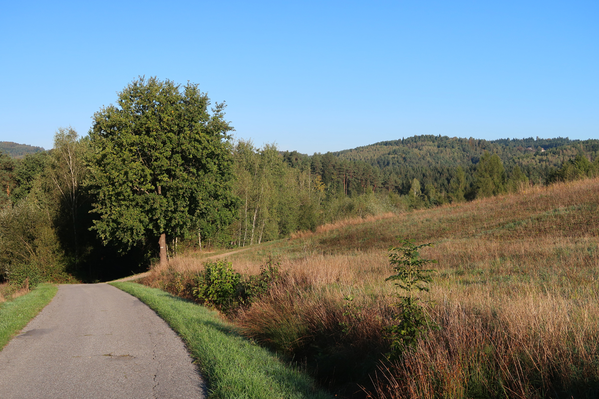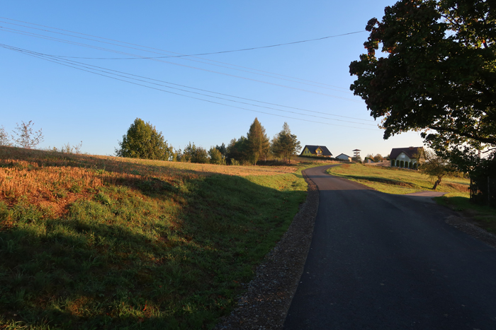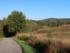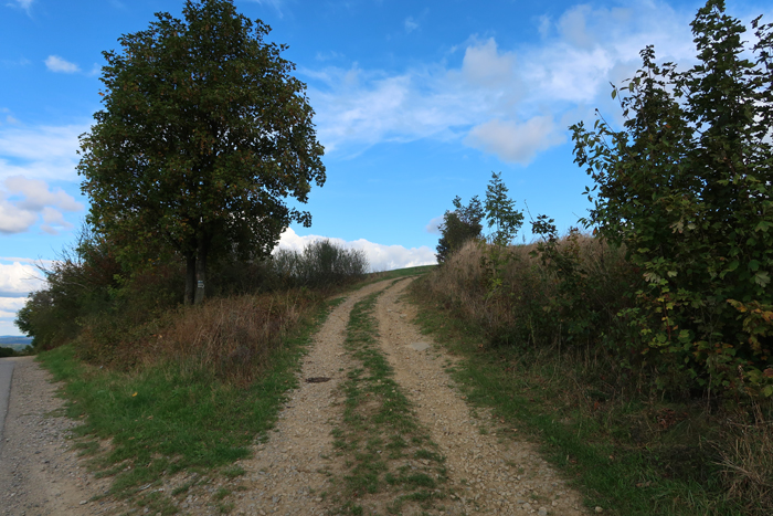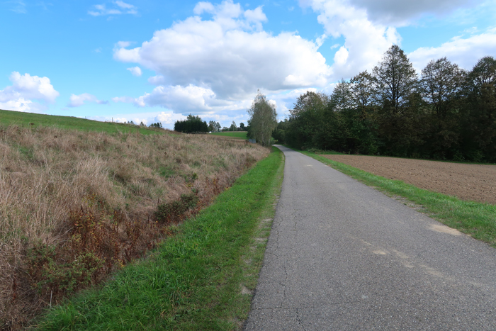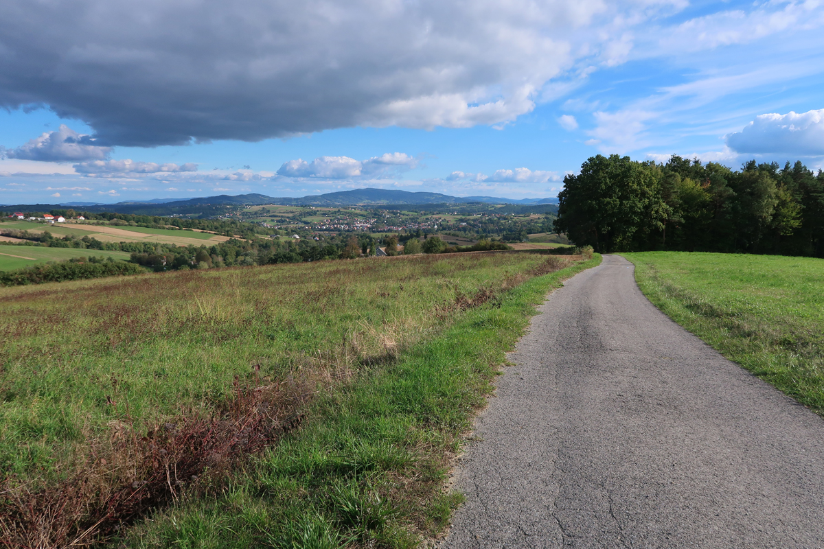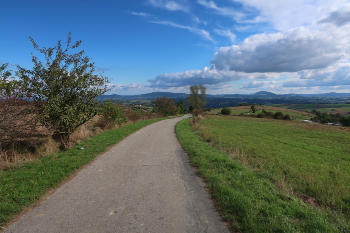 Po kilometrze dochodzimy do dróżki asfaltowej, którą zaczynamy schodzić łagodnie w dół. Cały czas idziemy grzbietem otwartym terenem.