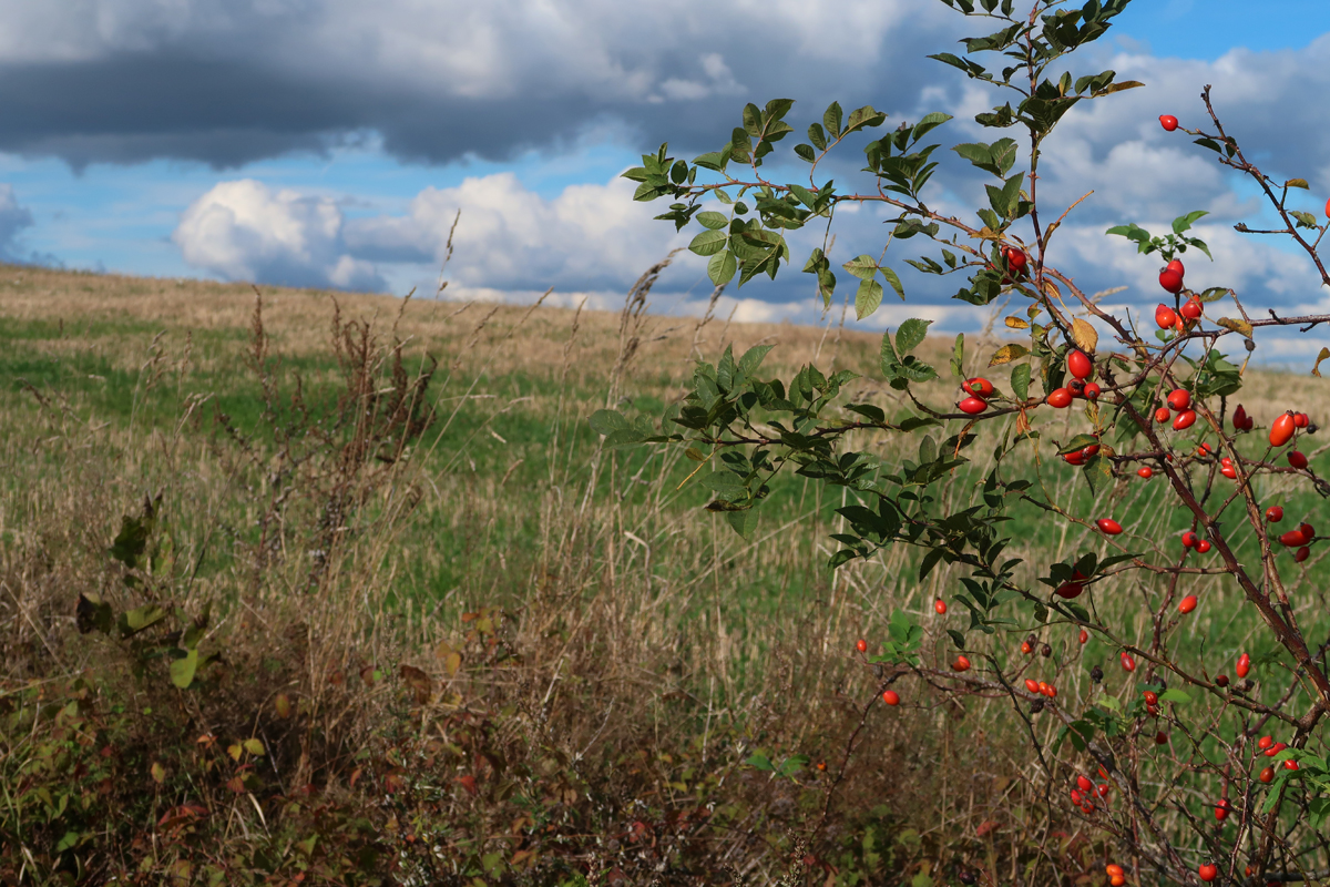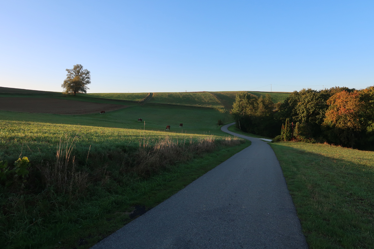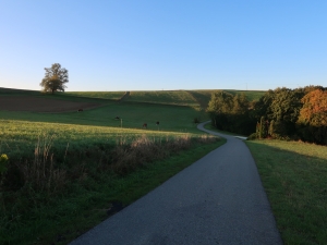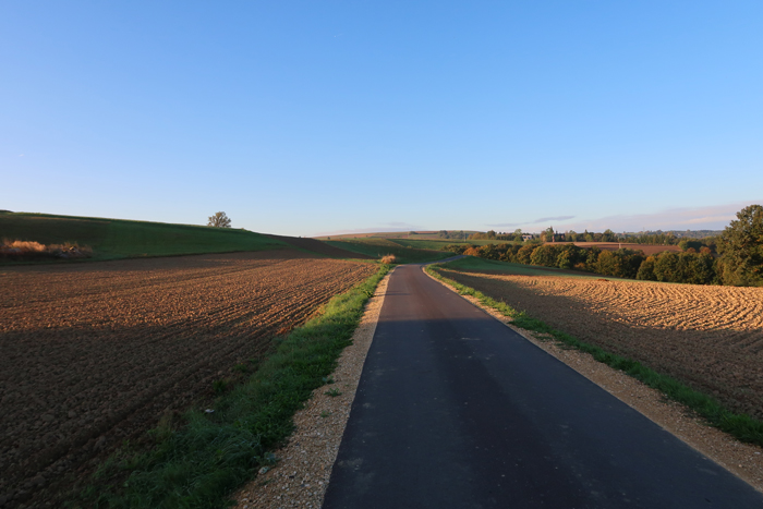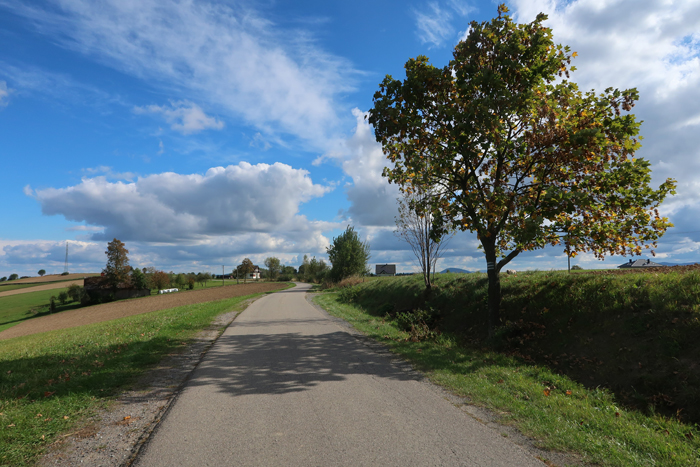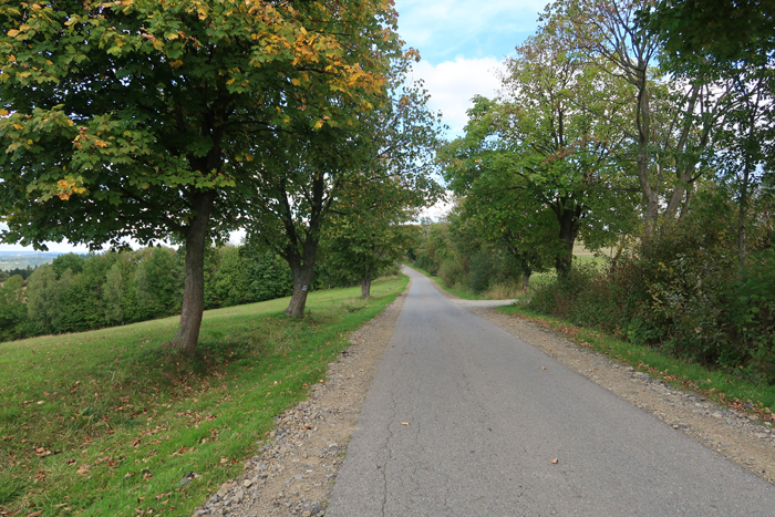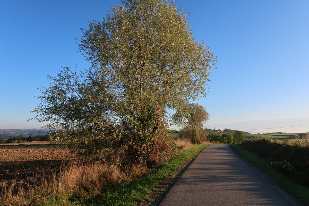 Po kilometrze dochodzimy do dróżki asfaltowej, którą zaczynamy schodzić łagodnie w dół. Cały czas idziemy grzbietem otwartym terenem.