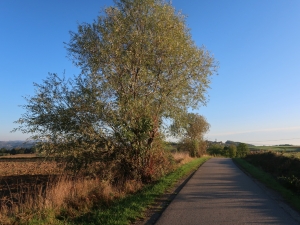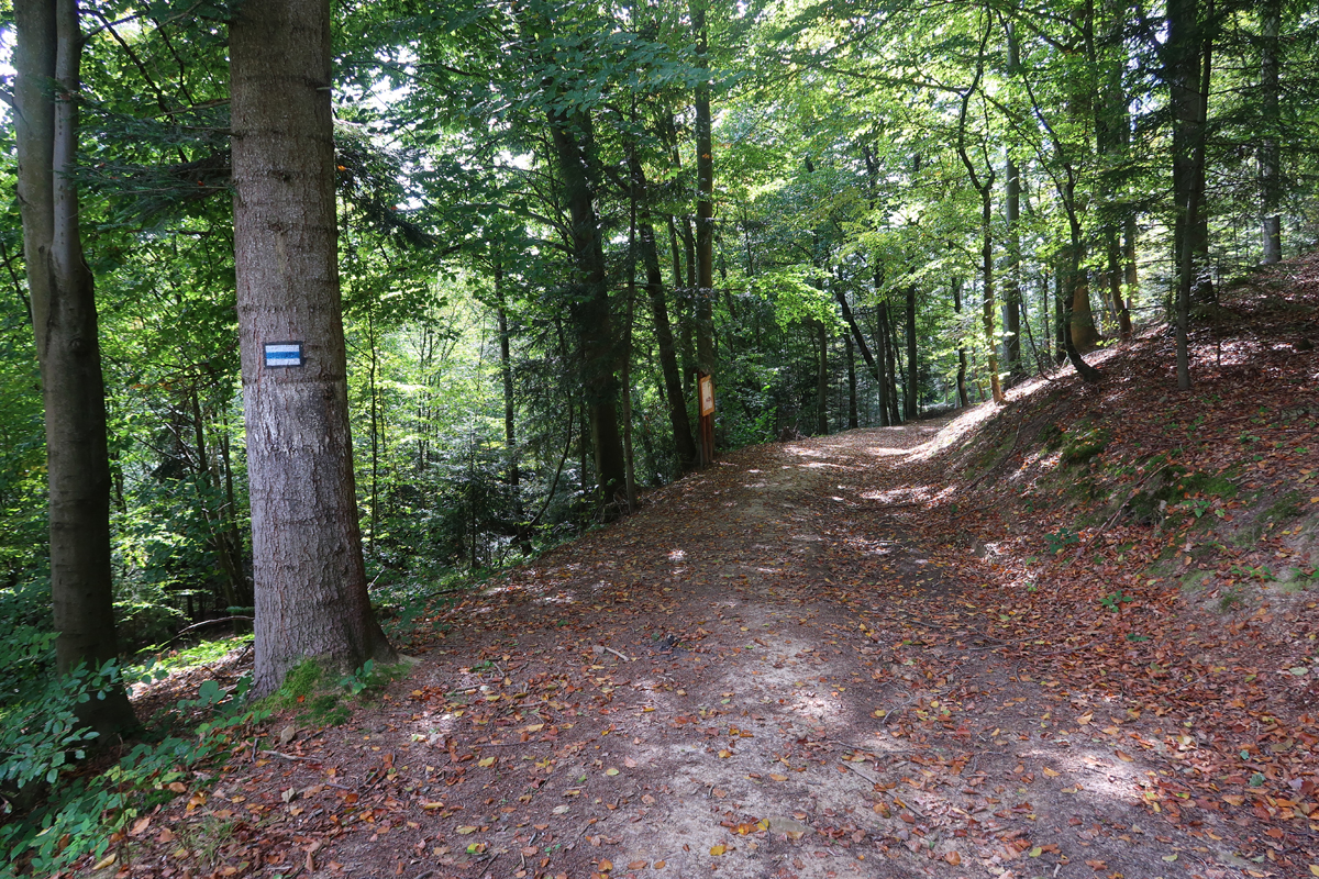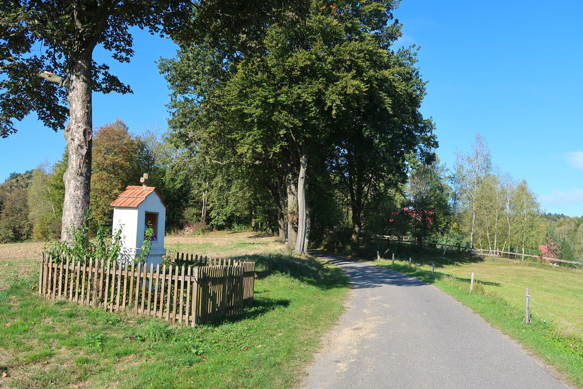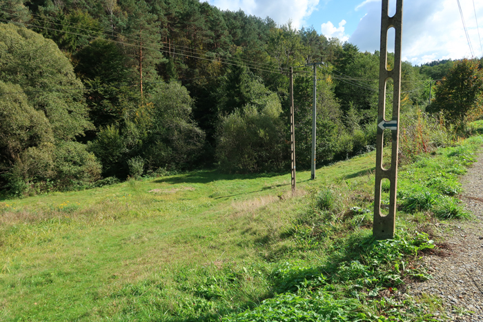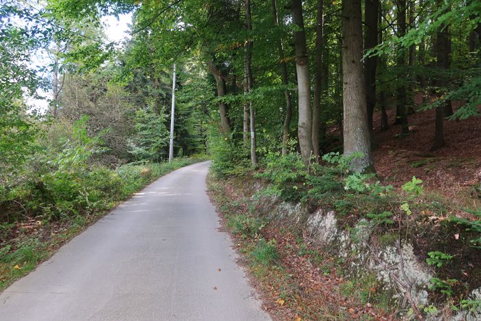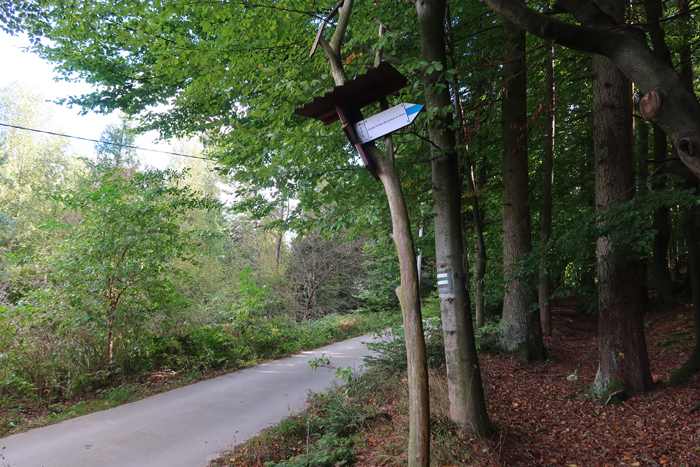 Po około 1 km wychodzimy z lasu i po chwili docieramy do drogi. Skręcamy w lewo i wędrujemy wraz ze szlakiem koloru niebieskiego.