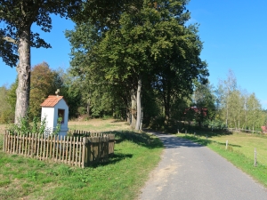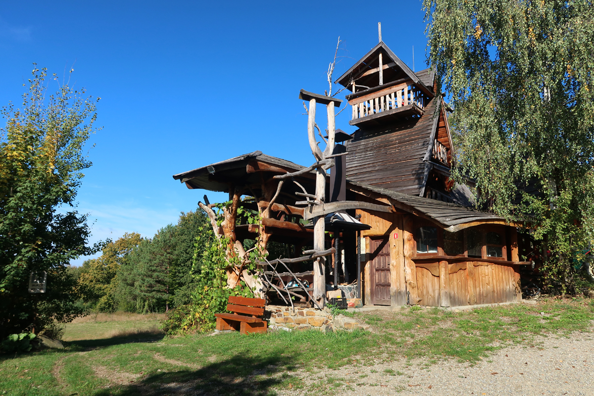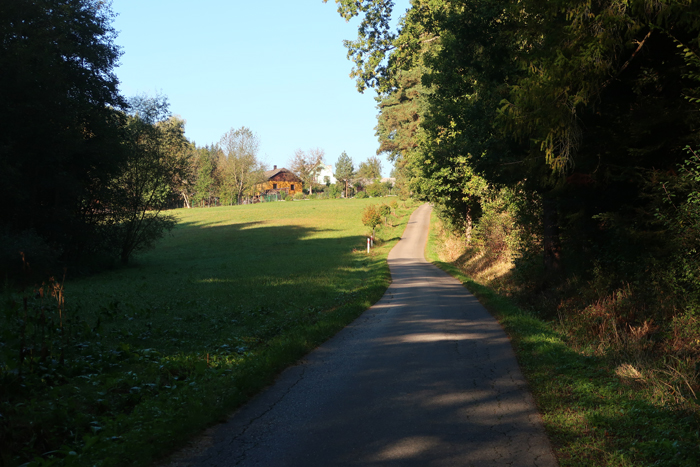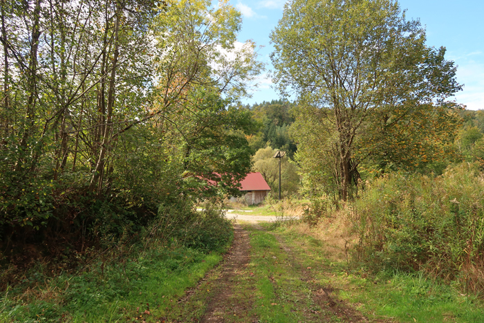 Idziemy lasem, gdzieniegdzie mijamy pojedyńcze domostwa.