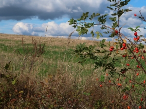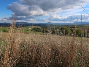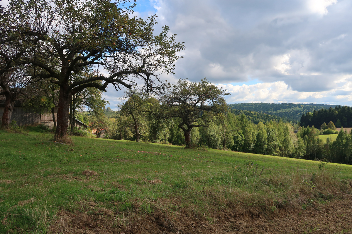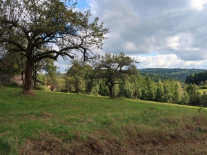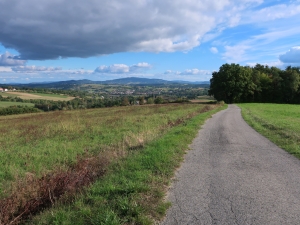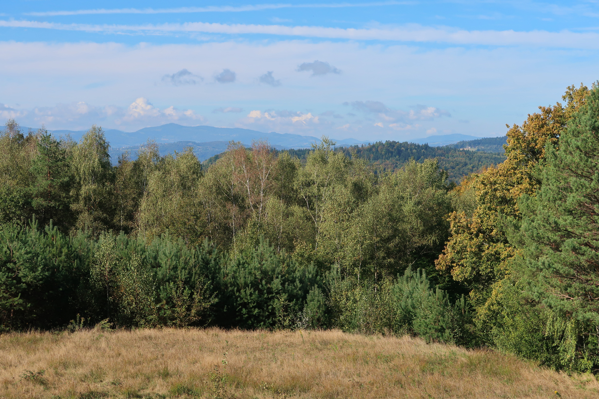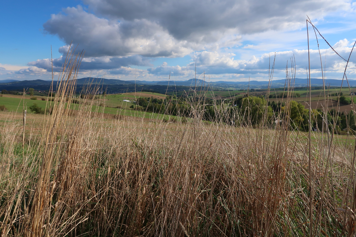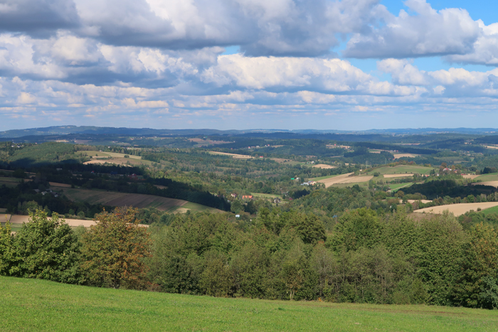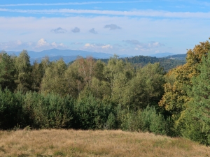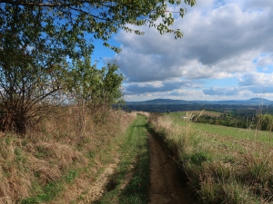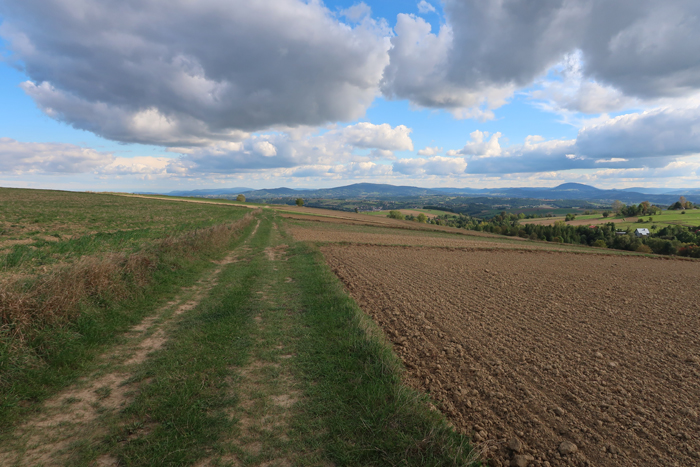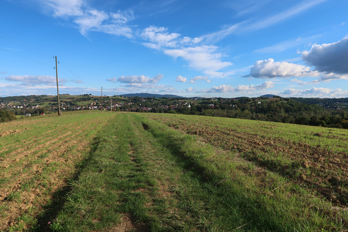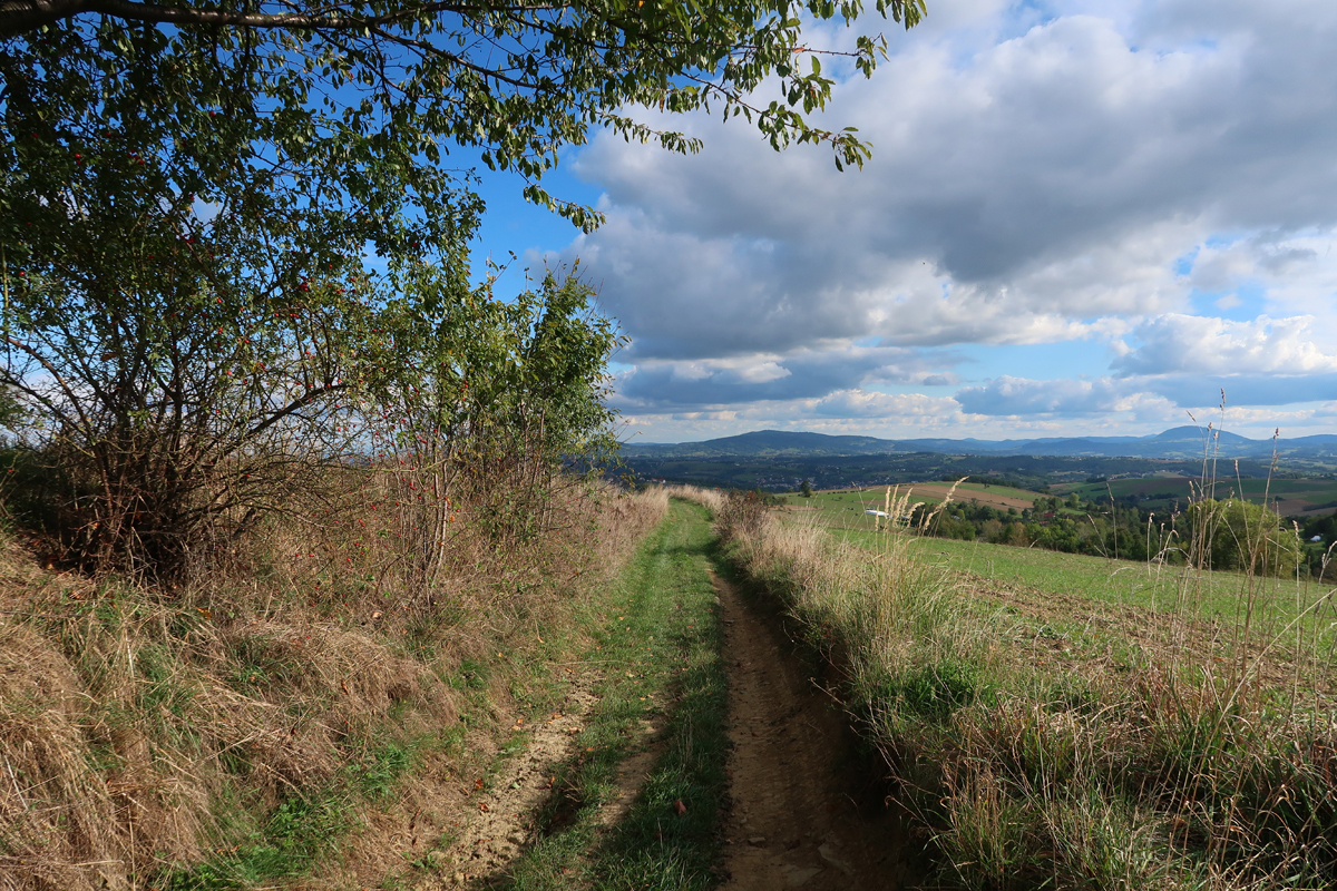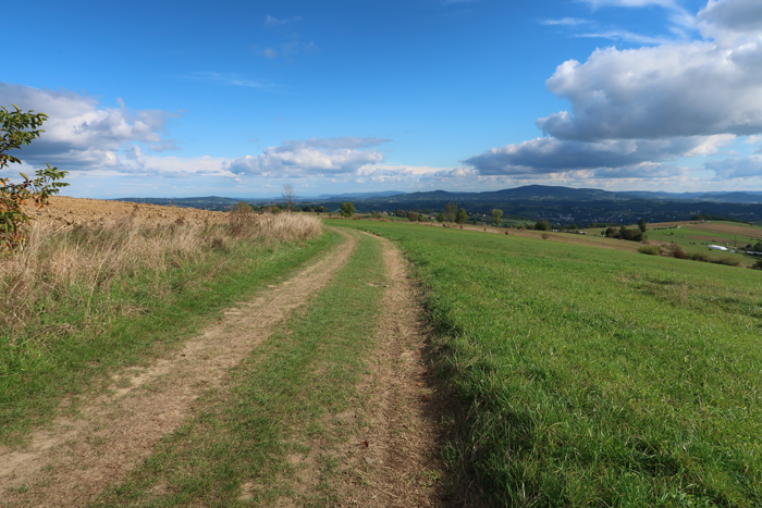 Idziemy najpierw pod górę a potem grzbietem przez pola i łąski. Mamy rozległe widoki na góry i pogórze.
