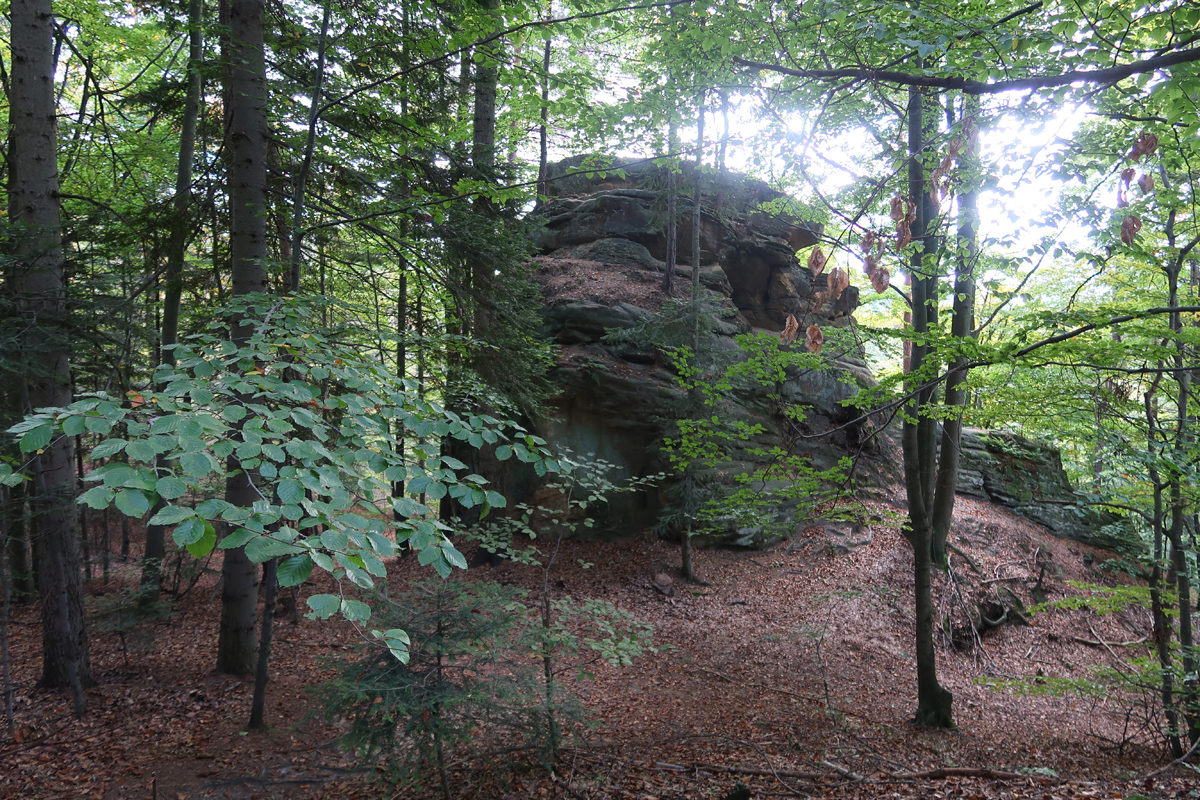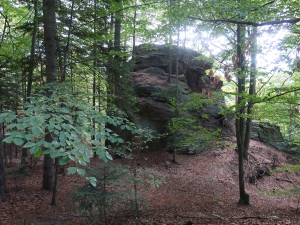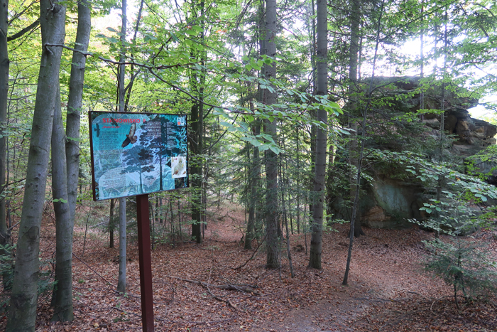 Zaczynamy dość mocne podejście do góry. Po około 10 minutach dochodzimy do rezerwatu przyrody nieożywionej "Diable Skały", położonym w najwyższym punkcie Bukowca 530 m n.p.m. Jest to długi grzbiet z malowniczymi wychodniami gruboławicowych piaskowców ciężkowickich opadający na zachód do doliny Paleśnianki. W lewo odchodzą czerwone znaki ścieżki dydaktycznej.