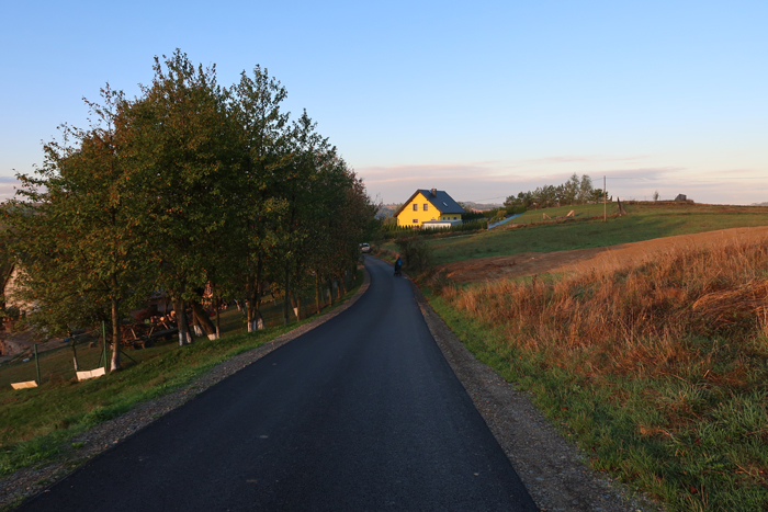 Idziemy drogą asfaltową wzniesieniami nad Falkową.