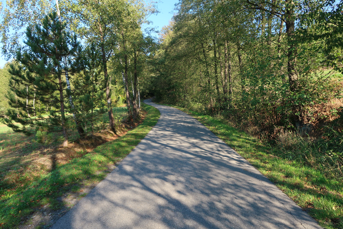 Po około 100 metrach skręcamy w prawo. Dołącza do nas niebieski szlak z Bukowca. Na odcinku 1km mamy dość mocne podejście asfaltem.