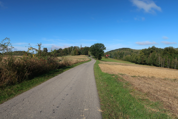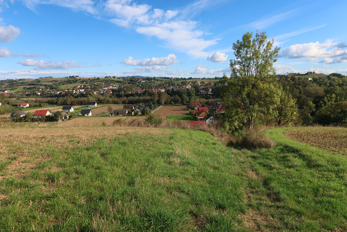Jamna na horyzoncie (widać już strzelisty wierzchołek wieży Kościoła w Jamnej)