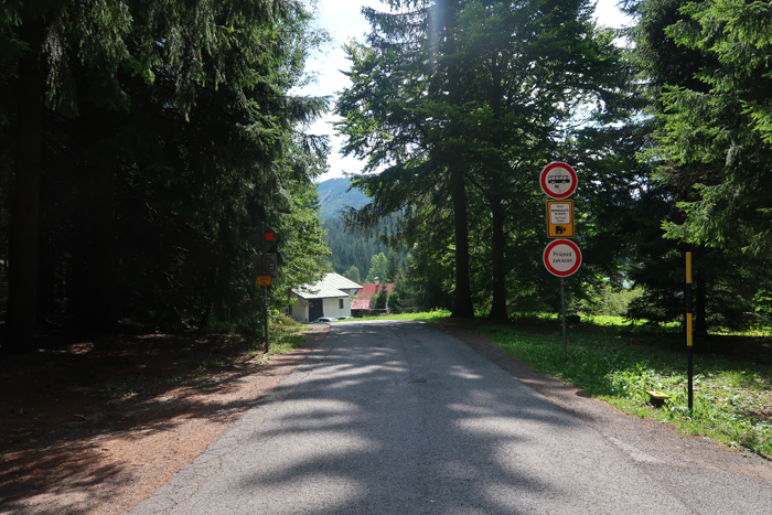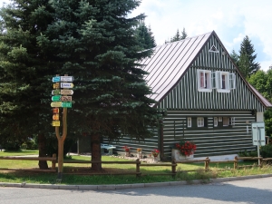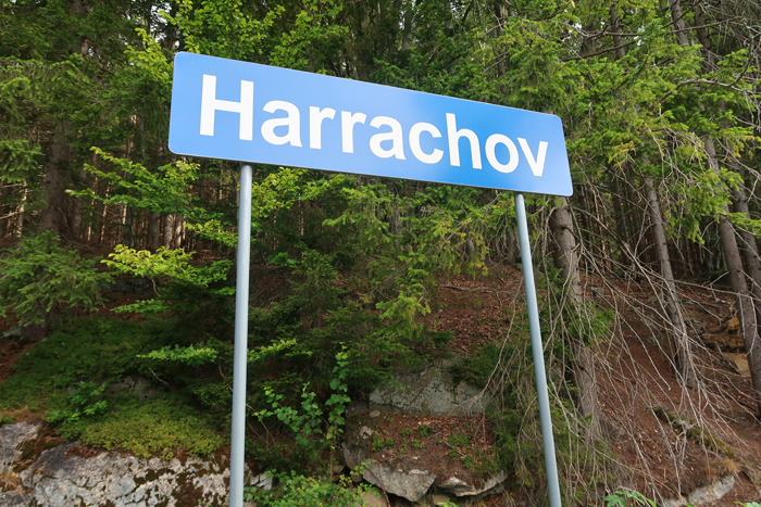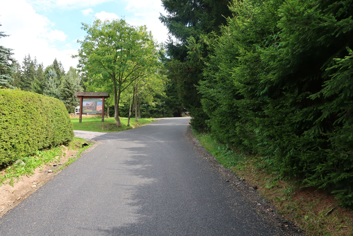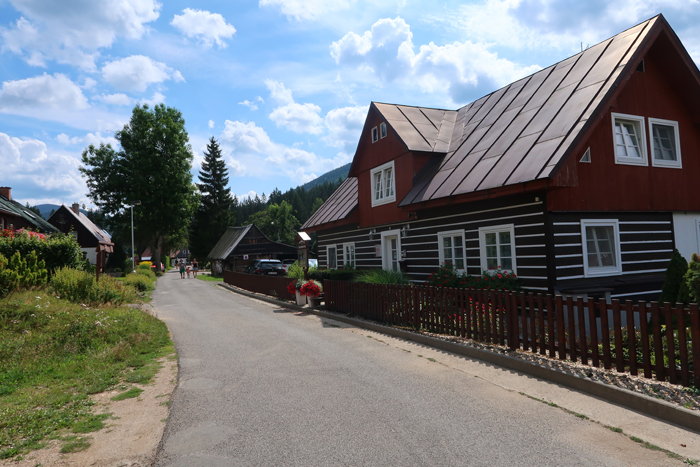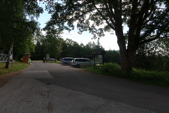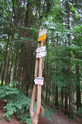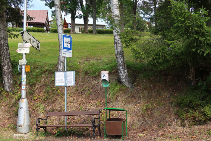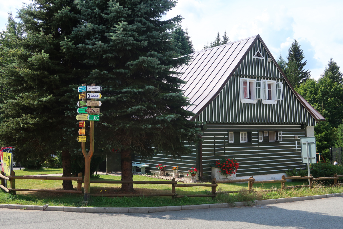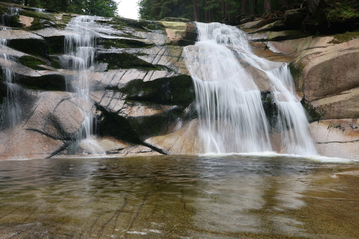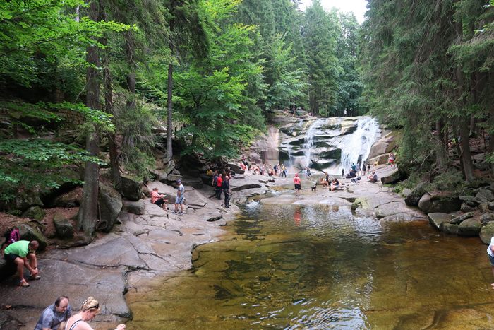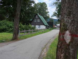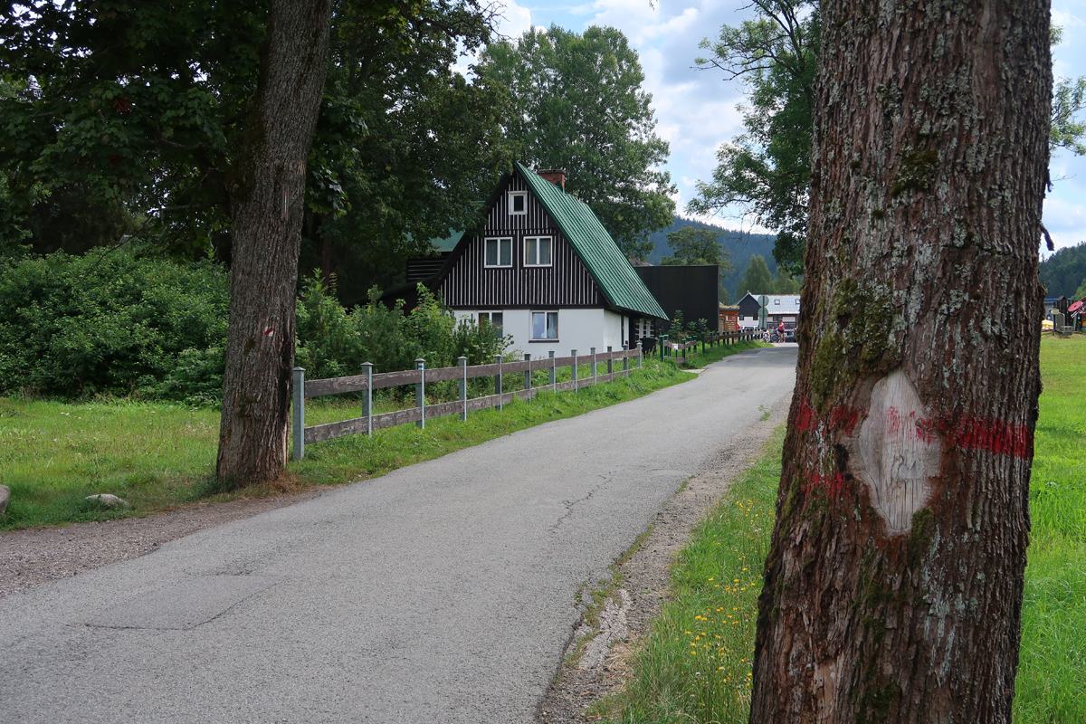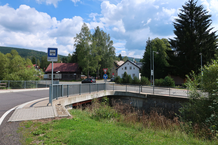 Po około półgodzinnej wędrówce dochodzimy do skrzyżowania szlaków na przystanku autobusowym Harrachov Diana. W tym miejscu rozpoczyna się szlak niebieski, którym można iść bezpośrednio do wodospadu. Jednak aby wycieczka była dostępna wózkiem robimy obejście. Podążamy dalej za znakami czerwonymi do Harrachov most i kawałek dalej. Skręcamy w następną ulicę w prawo opuszczając czerwony szlak.