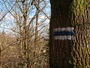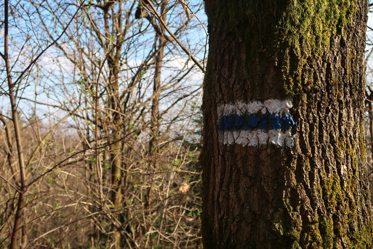 Po około 20 minutach dochodzimy do szlaku niebieskiego. W prawo prowadzi on do miejscowości Rajbrot. My podążamy nim prosto do końca naszej trasy.