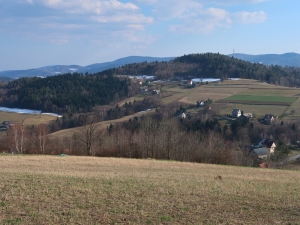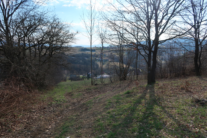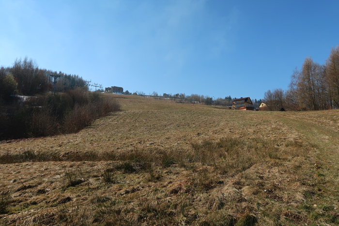 Idziemy teraz kawałek leśną ścieżką. Następnie wychodzimy na dużą polanę, którą dość stromo (szlak prowadzi stokiem narciarskim nieczynnego już wyciągu) pniemy się do góry.