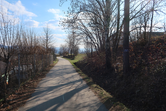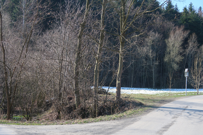 Idziemy prosto asfaltem, po kilku minutach lekko pod górę. Po około 10 minutach trzeba uważać na znaki bo szlak żółtej ścieżki spacerowej skręca w boczną dróżkę w lewo, po czym za rzeczką odrazu w prawo w kierunku lasu.