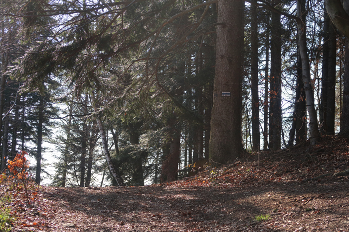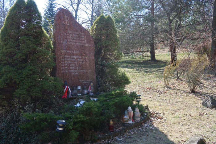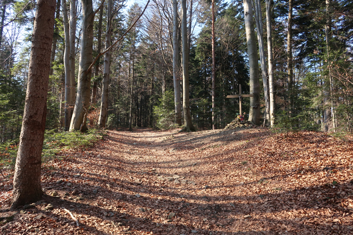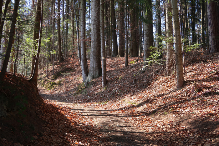 Idziemy dalej lasem i po chwili spotykamy odejście czarno znakowanej ścieżki spacerowej w prawo w kierunku Rajbrotu. Można zejść na chwilę za jej znakami i odwiedzić cmentarz wojenny nr 300.
