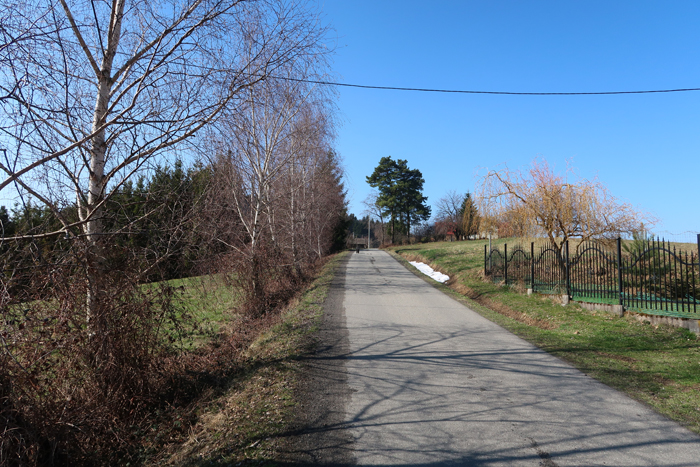 Najpierw kawałek lasem a potem wychodzimy na drogę asfaltową i docieramy do zabudowań.
