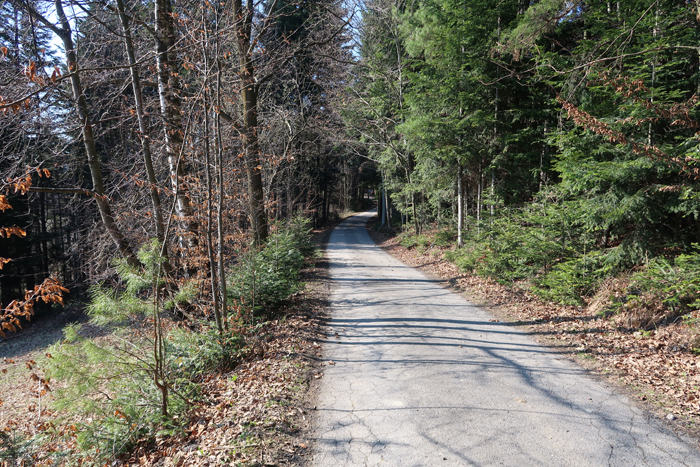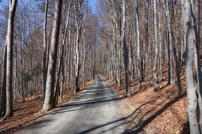 Idziemy teraz asfaltową drogę przez przepiękny las.