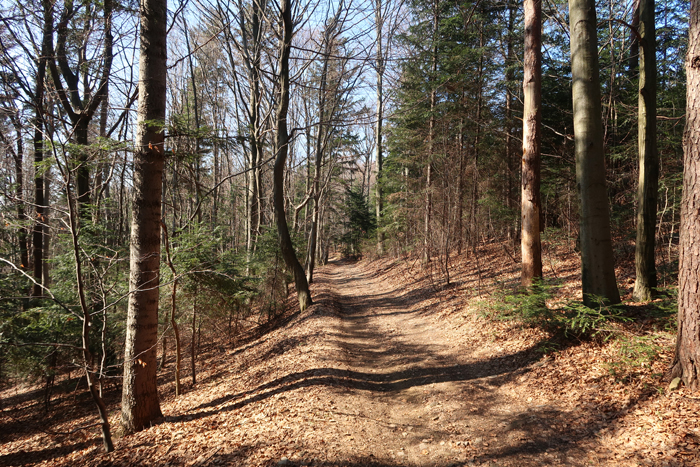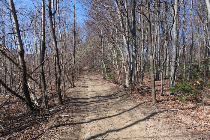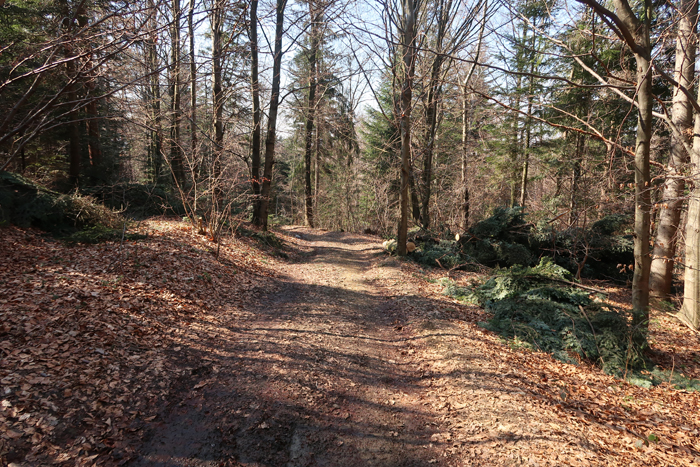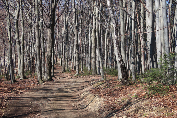 Po 10 minutach asfalt się kończy i wędrujemy lekko pod górę leśną drogą na szczyt Kopiec (585m n.p.m.).