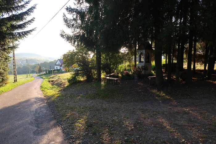 Mijamy kapliczkę po prawej stronie i około 30 minutach od rozwidlenia skręcamy w prawo i schodzimy coraz niżej, aż do ulicy Jakubowskiego w Grybowie.